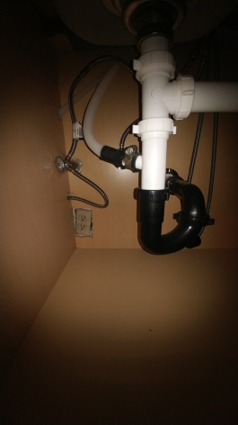 I have an outlet right by the drain and supply lines (as pictured). This doesn't seem safe as one leak couldn't be bad news. Is this violating code? I'm in MN. By the way, it is not a GFCI outlet...