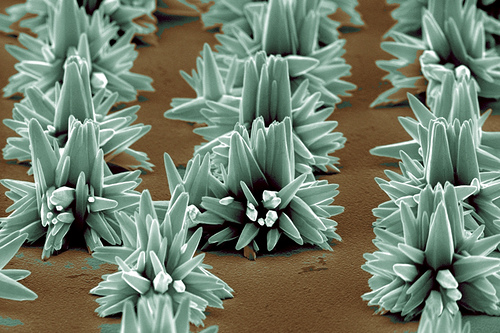 A scanning electron microscopy image of zinc oxide nanorod clusters on a silver surface. ZnO nanostructured materials show promising applications in chemical sensors, photocatalysis, and nanoscale optoelectronic devices. Image Source: Sandia National Laboratories FYI- This photo is part of the: Nanotechnology Takes Off - KQED QUEST Flickr Set.