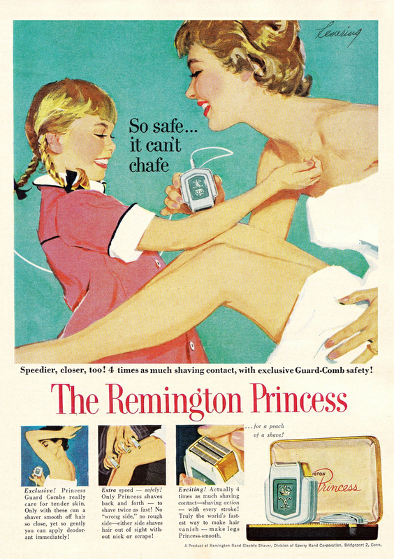 "Suzy, now that we have the new Remington Princess with exclusive Guard-Comb safety, no one has to know about your arm hair problem!" "McCall's" November 1958
