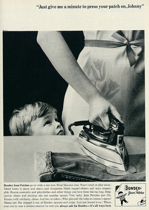 Tagline: "Just give me a minute to press your patch on, Johnny" Opening ad text: "Bondex Jean Patches go on with a hot iron. Wear like cast iron. Won't wash or play away. Mend knees in jeans and slacks and dungarees. Make ragged elbows and seat respectable.