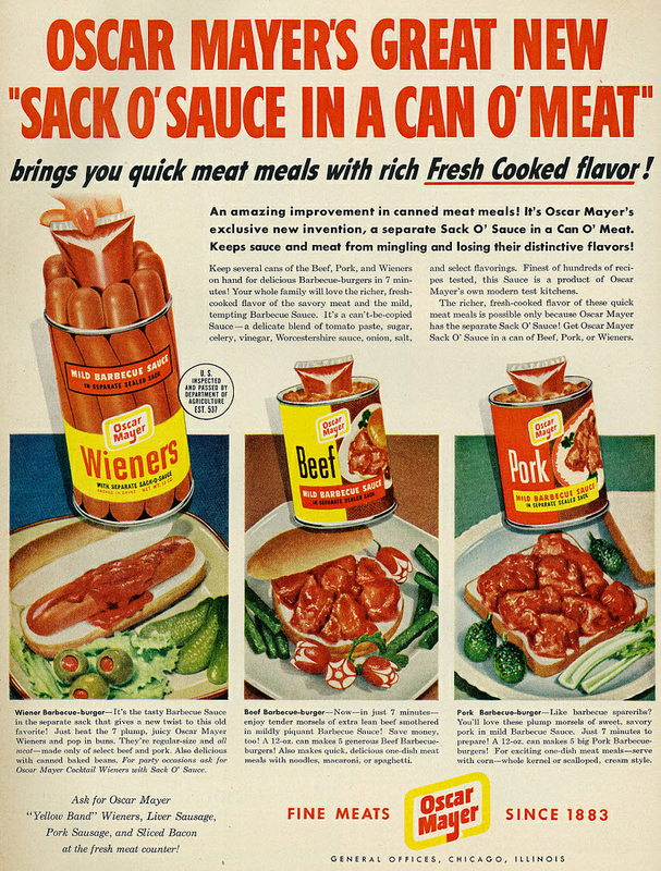 Vintage illustrated 1950s magazine advertisement, Oscar Mayer's Sack O' Sauce in a Can O' Meat, 1950 Tagline: "Oscar Mayer's great new 'Sack O' Sauce in a Can O' Meat' brings you quick meat meals with rich Fresh-Cooked flavor!" Published in Life magazine, May 15, 1950 - Vol. 28, No.